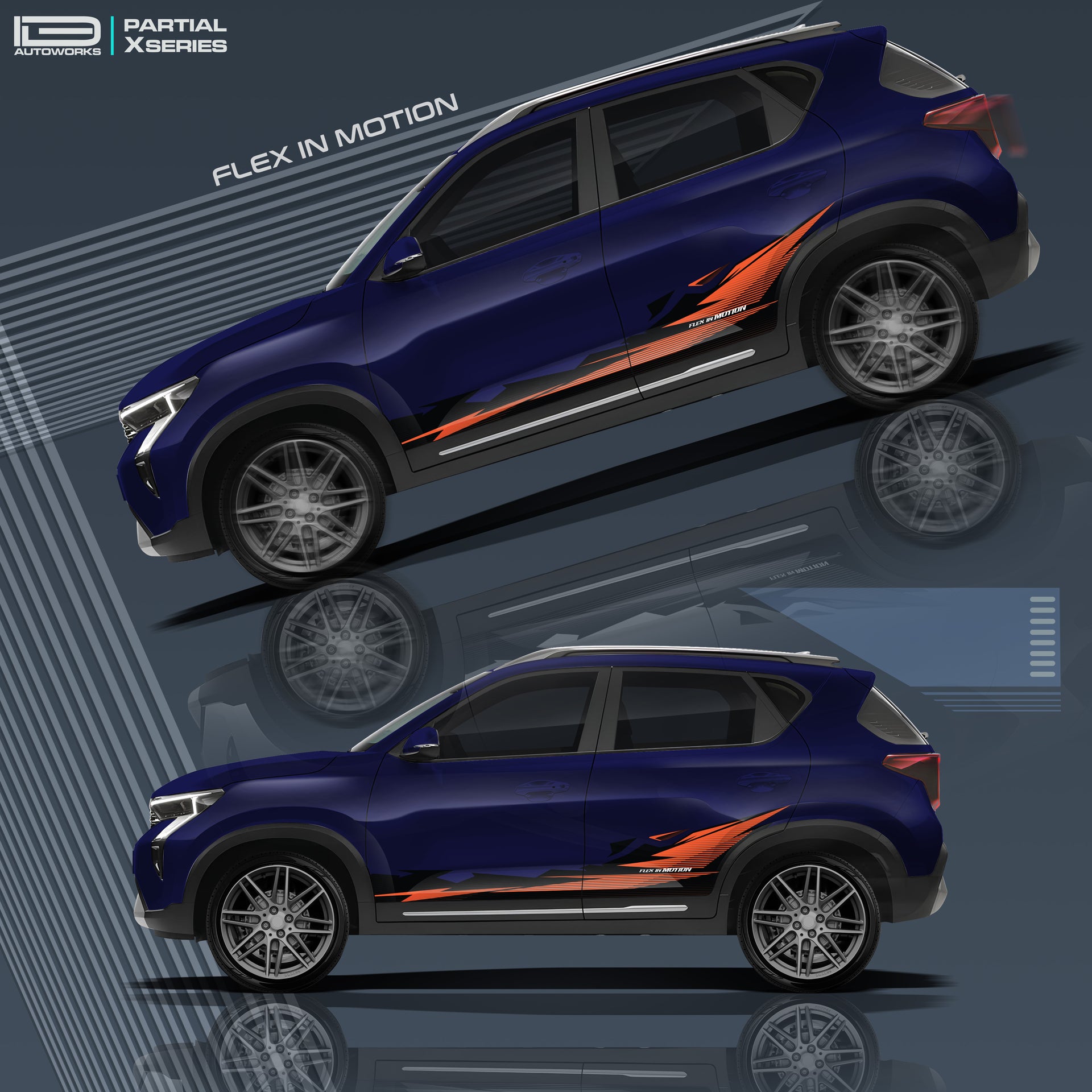 Designed to express speed and fluidity, the Flex in Motion edition features sweeping Orange - Black gradients with angular motion cuts. This bold, aerodynamic graphic treatment adds a sense of movement and style, making your hatchback look fast even at a standstill.