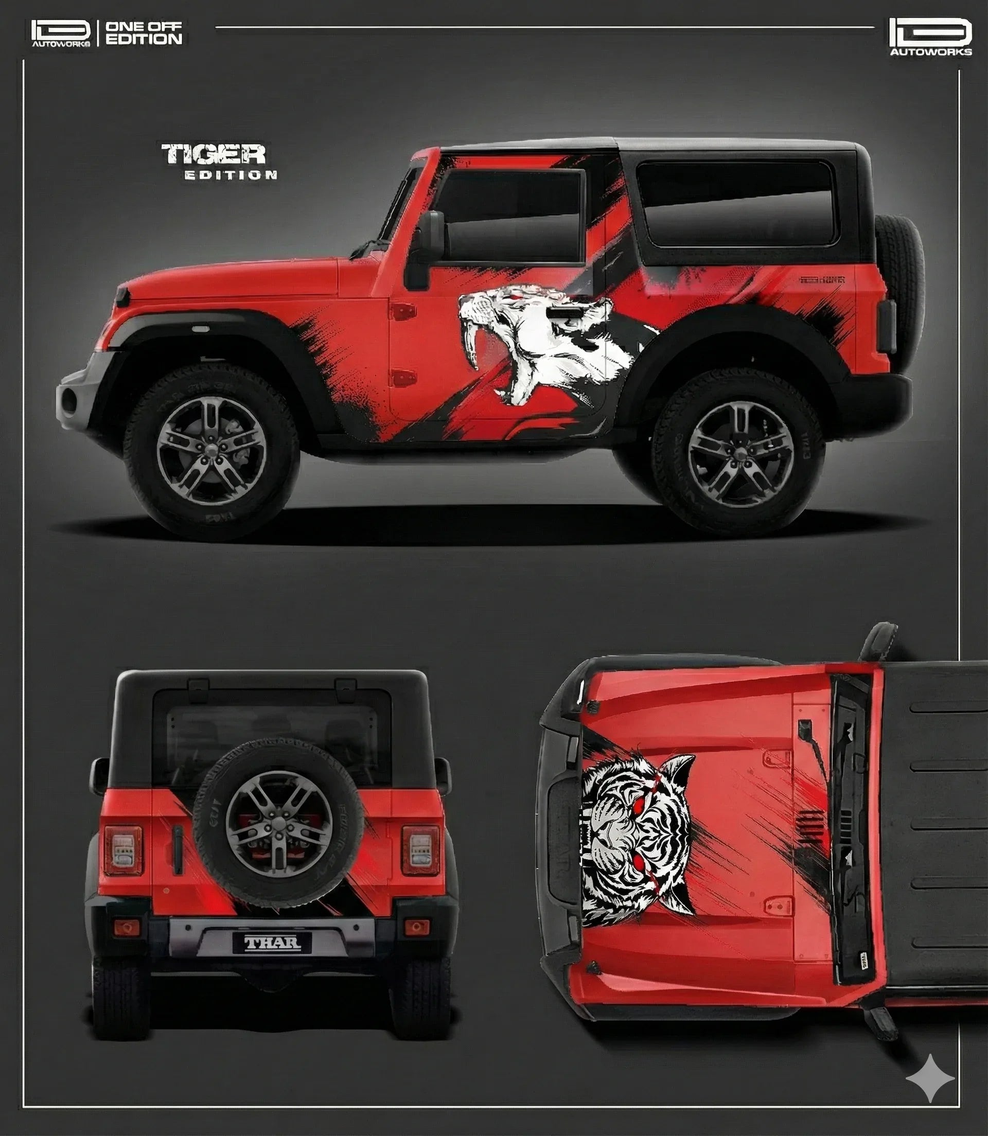 With flowing, muscular graphics, sharp accents, and a strong directional layout, the Tiger Edition enhances the Thar’s rugged proportions while amplifying its aggressive stance. It’s bold yet controlled — a visual expression of power, agility, and prestige.