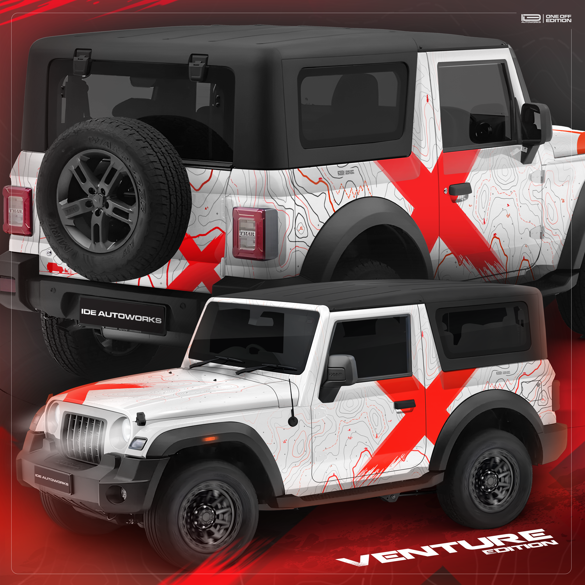 The VentureX Edition from the IDE One-Off Edition gives the Mahindra Thar a bold, exploration-driven identity. Inspired by modern adventure, evolving terrain, and the Thar’s iconic off-road legacy reimagined for the future, this edition enhances the Thar with a rugged yet progressive visual language that feels confident, capable, and refined.