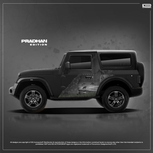 The Pradhan Edition Design Wrap for Thar celebrates the rich heritage of Haryana, blending traditional elements with modern flair. Featuring bold patterns inspired by Haryanvi culture, this wrap exudes strength, pride, and rural elegance, perfect for those who honour their roots while embracing adventure.