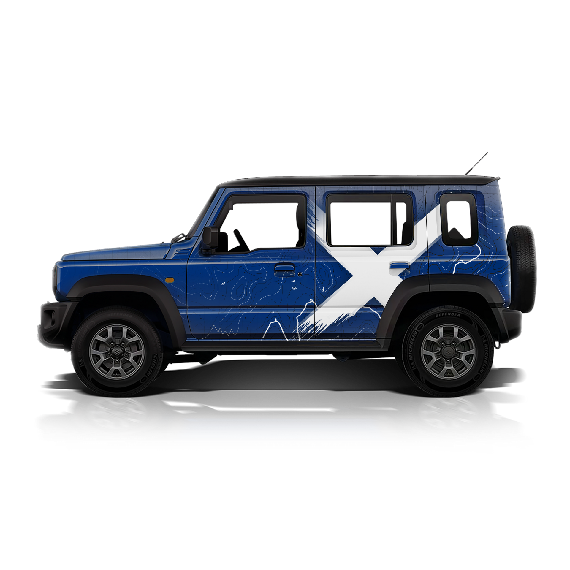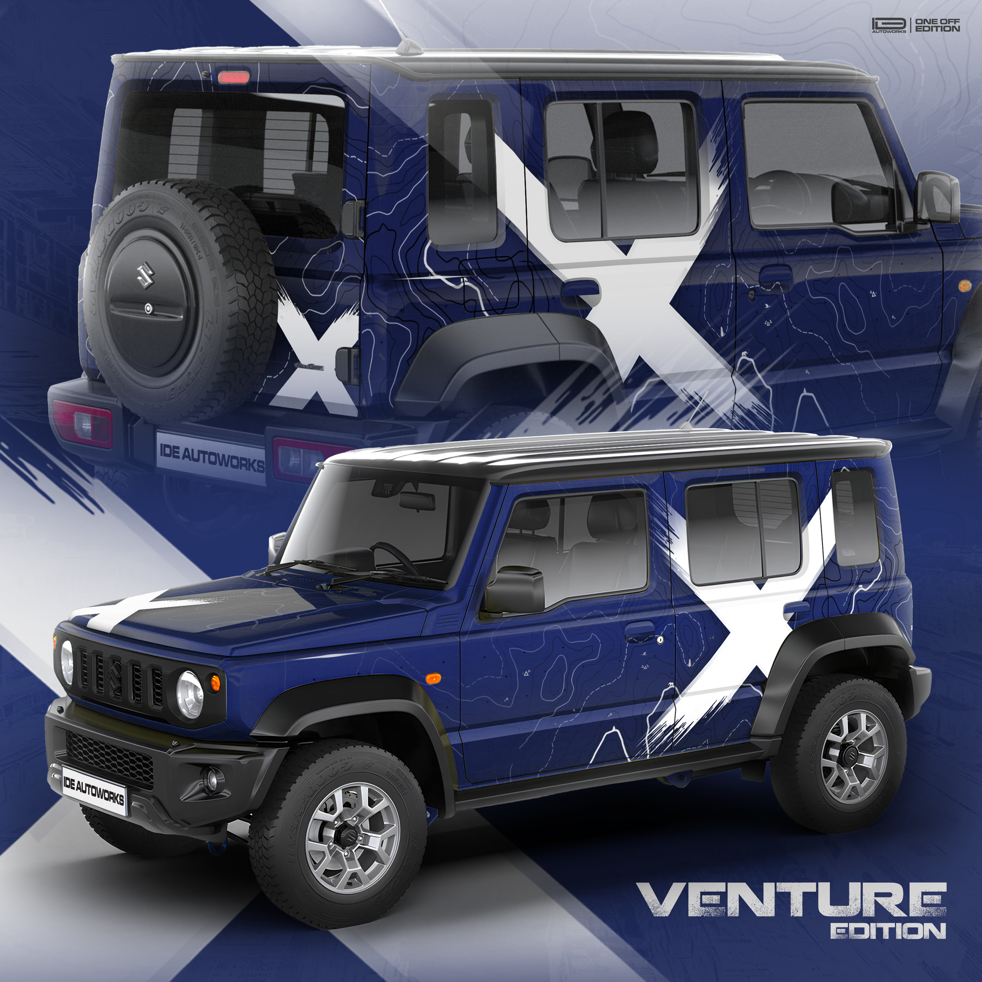 Designed as a complete visual language rather than a surface accent, VentureX introduces a strong X-form visual core, layered topographic contour detailing, and directional elements that enhance the Jimny’s boxy proportions with depth, motion, and presence. Every graphic is intentional—amplifying character without compromising the vehicle’s pure, functional design.