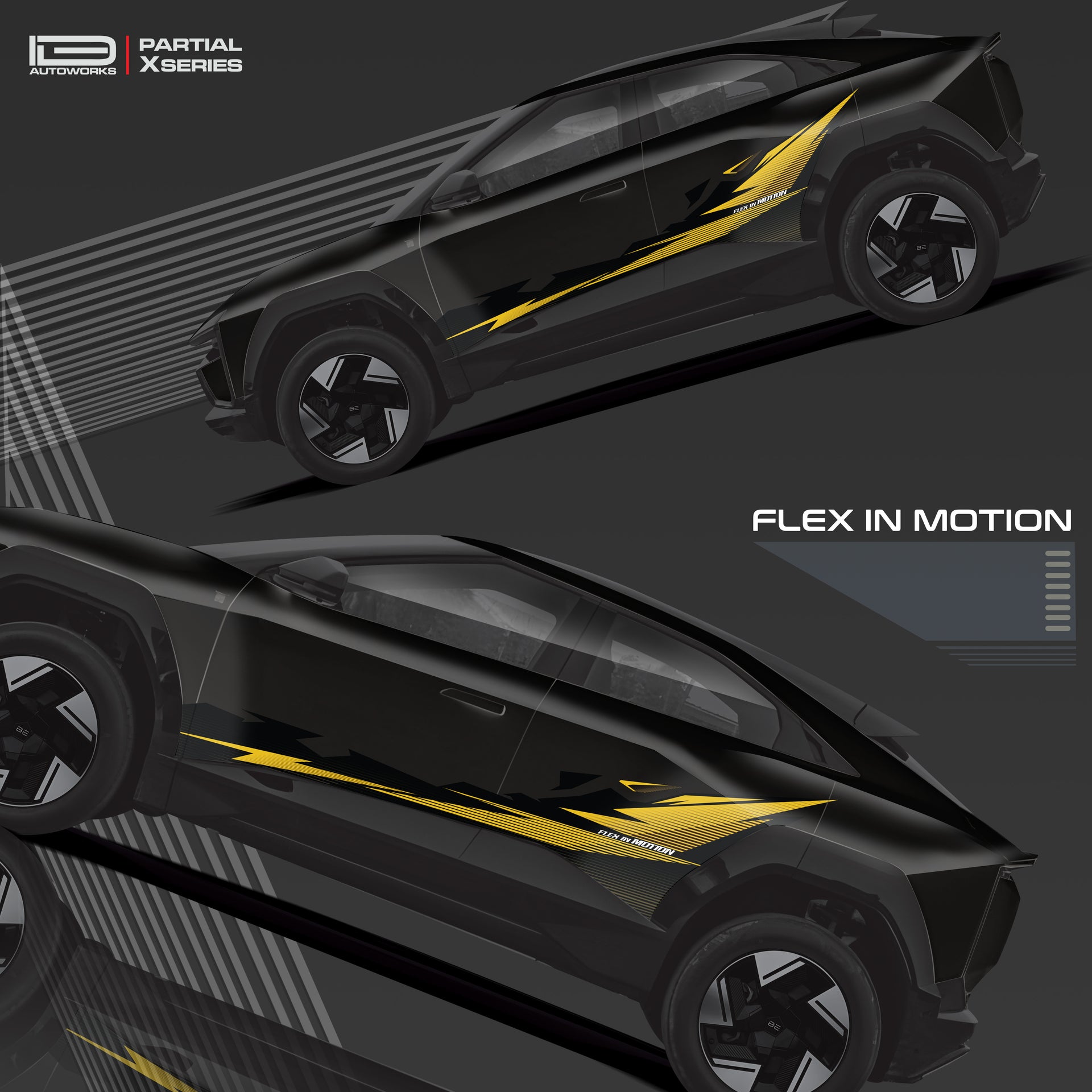 A bold, race-inspired graphic package with Black - Yellow streaks and tech-style detailing. Part of the Partial X Series, the CoreX Edition adds aggressive style and street-ready attitude to your hatchback.