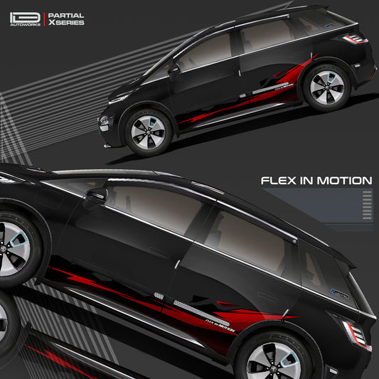 Designed to express speed and fluidity, the Flex in Motion edition features sweeping red-White gradients with angular motion cuts. This bold, aerodynamic graphic treatment adds a sense of movement and style, making your hatchback look fast even at a standstill.