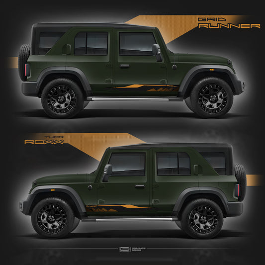 The Grid Runner Edition on Thar Roxx features a sleek urban-inspired graphic design, seamlessly blending the bold, rugged character of the Thar with modern city vibes. These decals create a dynamic, street-smart look that adds an edge to your Thar, making it stand out wherever the urban adventure takes you.