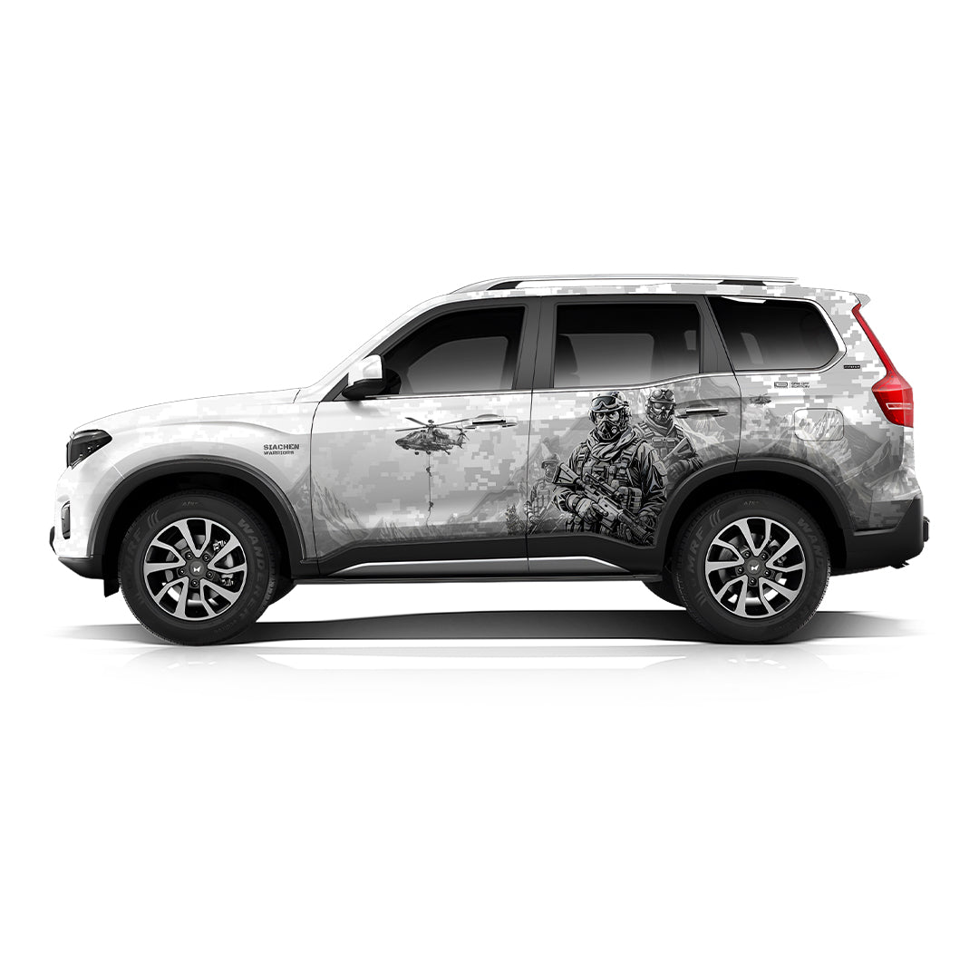 Forged in the spirit of the world’s highest battlefield, the Warrior Edition is a full wrap that echoes the resilience and raw beauty of Siachen. With rugged textures, snow-camouflage tones, and battle-hardened design elements, this wrap transforms your car into a moving tribute to grit and glory.