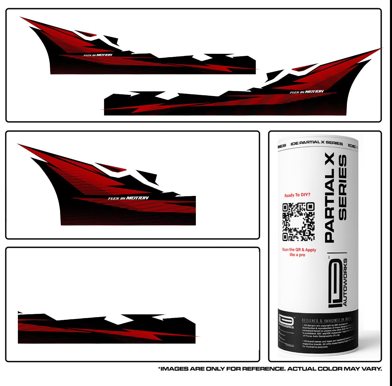 Say hello to Flex in Motion — the latest addition to our IDE Partial X Series, designed to inject instant energy and movement into your car's profile. This dynamic graphic kit features bold, flowing elements that run along the lower side panels, giving your vehicle a sporty, ground-hugging stance that looks fast even when standing still.